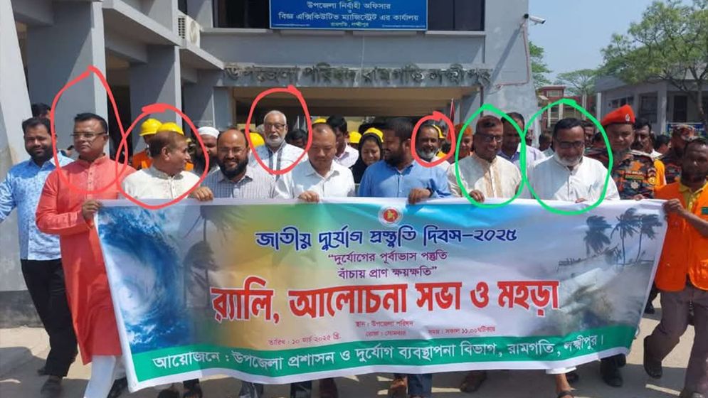 জাতীয় দুর্যোগ প্রস্তুতি দিবস উপলক্ষে লক্ষ্মীপুরের রামগতিতে র্যালির আয়োজন করে উপজেলা প্রশাসন ও দুর্যোগ ব্যবস্থাপনা বিভাগ। গত সোমবার সকালে হওয়া সেই র্যালিতে অংশ নিয়েছেন বিএনপি ও আওয়ামী লীগের স্থানীয় প্রভাবশালী নেতারা। এরপরই শুরু হয়েছে আলোচনা-সমালোচনা।