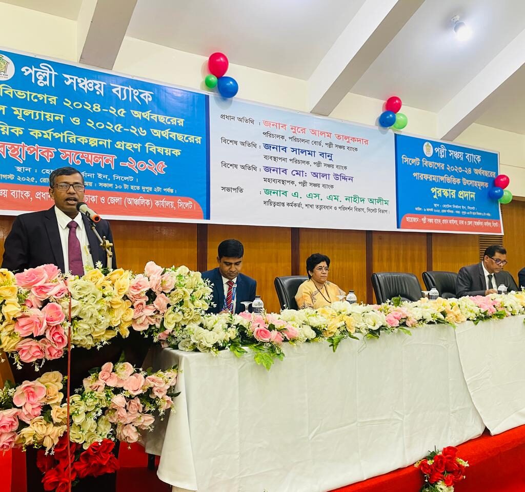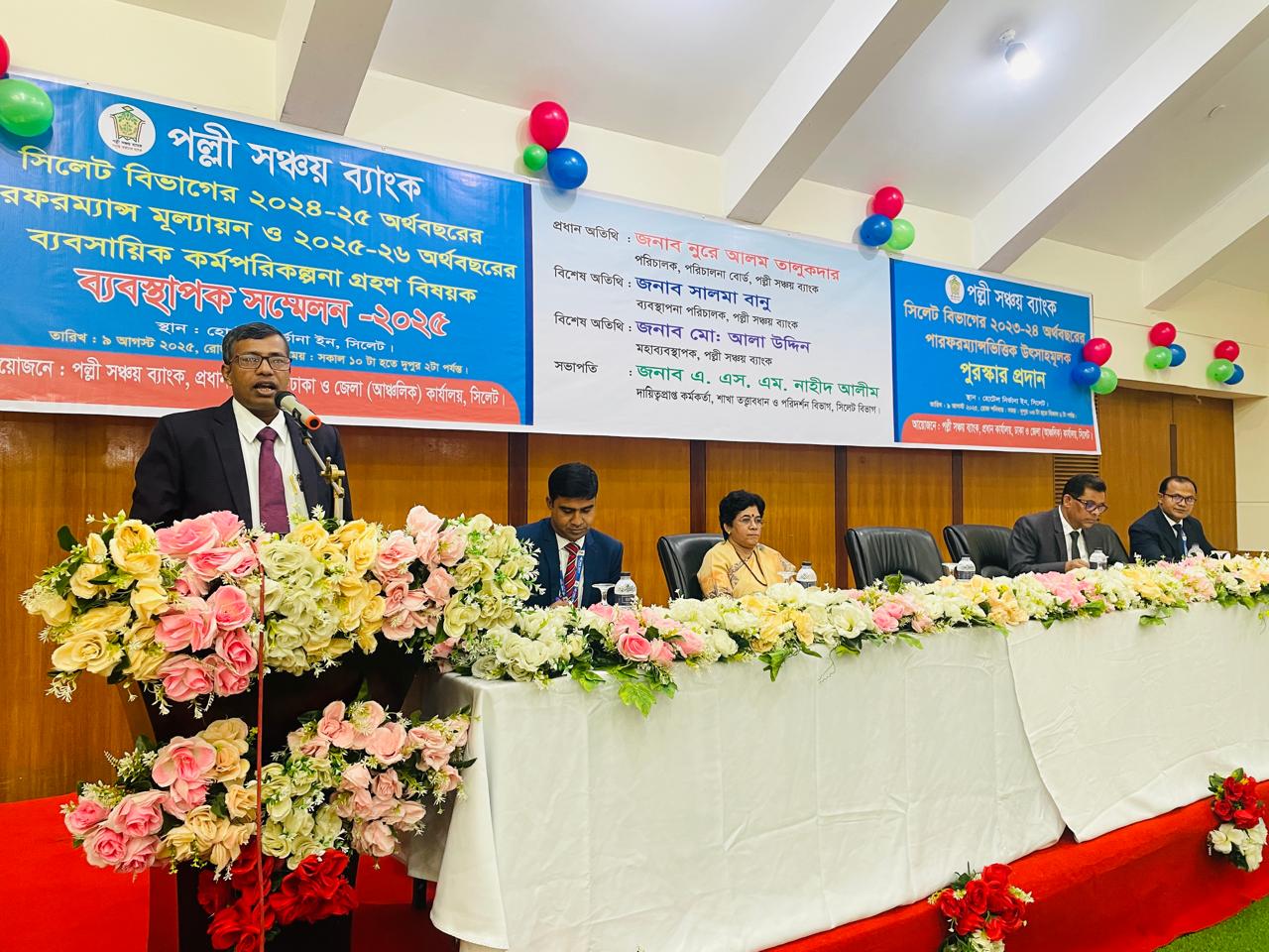 পল্লী সঞ্চয় ব্যাংকের সিলেট বিভাগীয় ব্যবস্থাপক সম্মেলন অনুষ্ঠিত হয়েছে। এতে পারফরম্যান্স মূল্যায়ন এবং নতুন অর্থবছরের ব্যবসায়িক পরিকল্পনা বিষয়ে সরাসরি মতামত দেন শাখা ব্যবস্থাপকরা। পল্লী সঞ্চয় ব্যাংকের সিলেট বিভাগের আওতাধীন শাখাসমূহের ২০২৪-২৫ অর্থবছরের পারফরম্যান্স মূল্যায়ন এবং ২০২৫-২৬ অর্থবছরের ব্যবসায়িক পরিকল্পনা প্রণয়নের লক্ষ্যে শনিবার সিলেটে এ সম্মেলন অনুষ্ঠিত হয়।