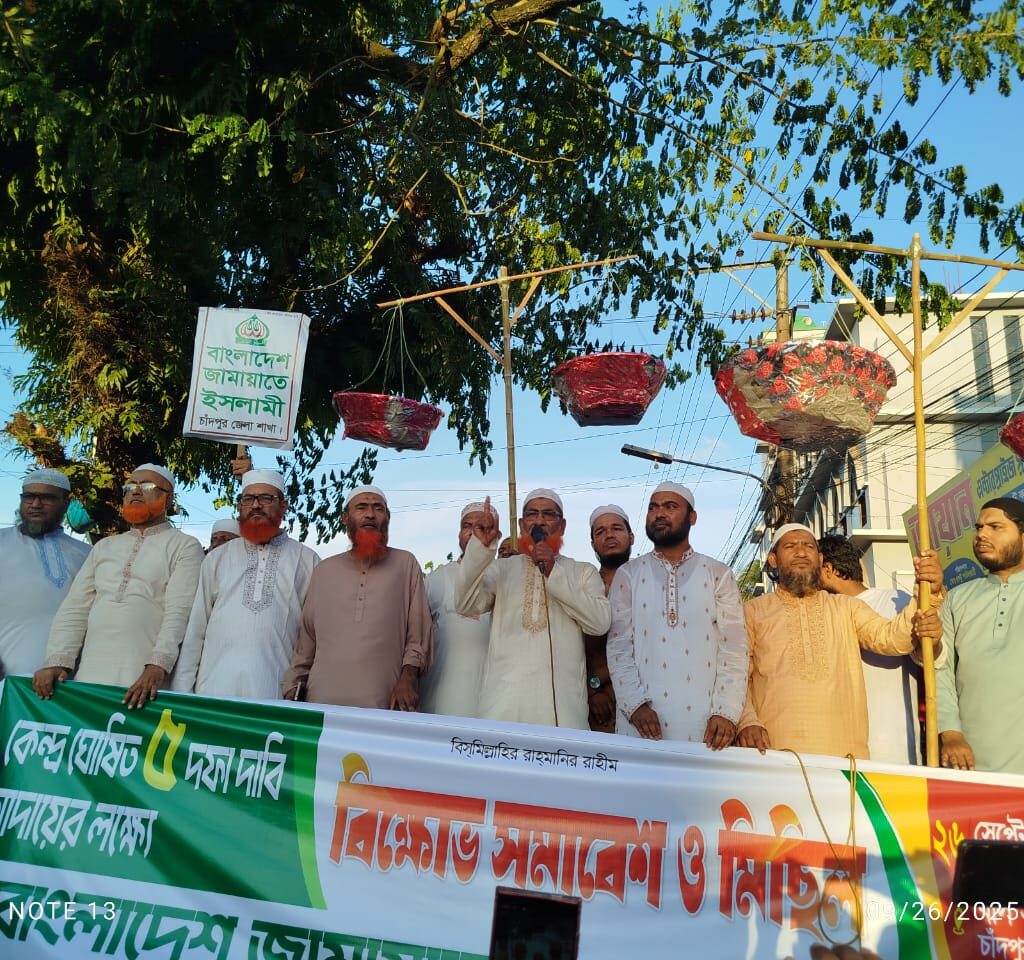 কেন্দ্র ঘোষিত ৫ দফা দাবি আদায়ের লক্ষ্যে বাংলাদেশ জামায়াতে ইসলামী চাঁদপুর জেলা শাখার উদ্যোগে বিক্ষোভ সমাবেশ ও মিছিল অনুষ্ঠিত হয়েছে। শুক্রবার বিকেলে চাঁদপুর বাসস্ট্যান্ডে সমাবেশ এর আয়োজন করা হয়। পরে বাসস্টেশন থেকে মিছিল শুরু হয়ে শহরের মিশন রোড়, হাজী মহসিন রোড়, নতুন বাজার হয়ে বাইতুল আমিন চত্তর সহ বিভিন্ন সড়ক প্রদক্ষিণ করে চাঁদপুর হাসান আলী মাঠে গিয়ে মিছিল শেষ হয়।